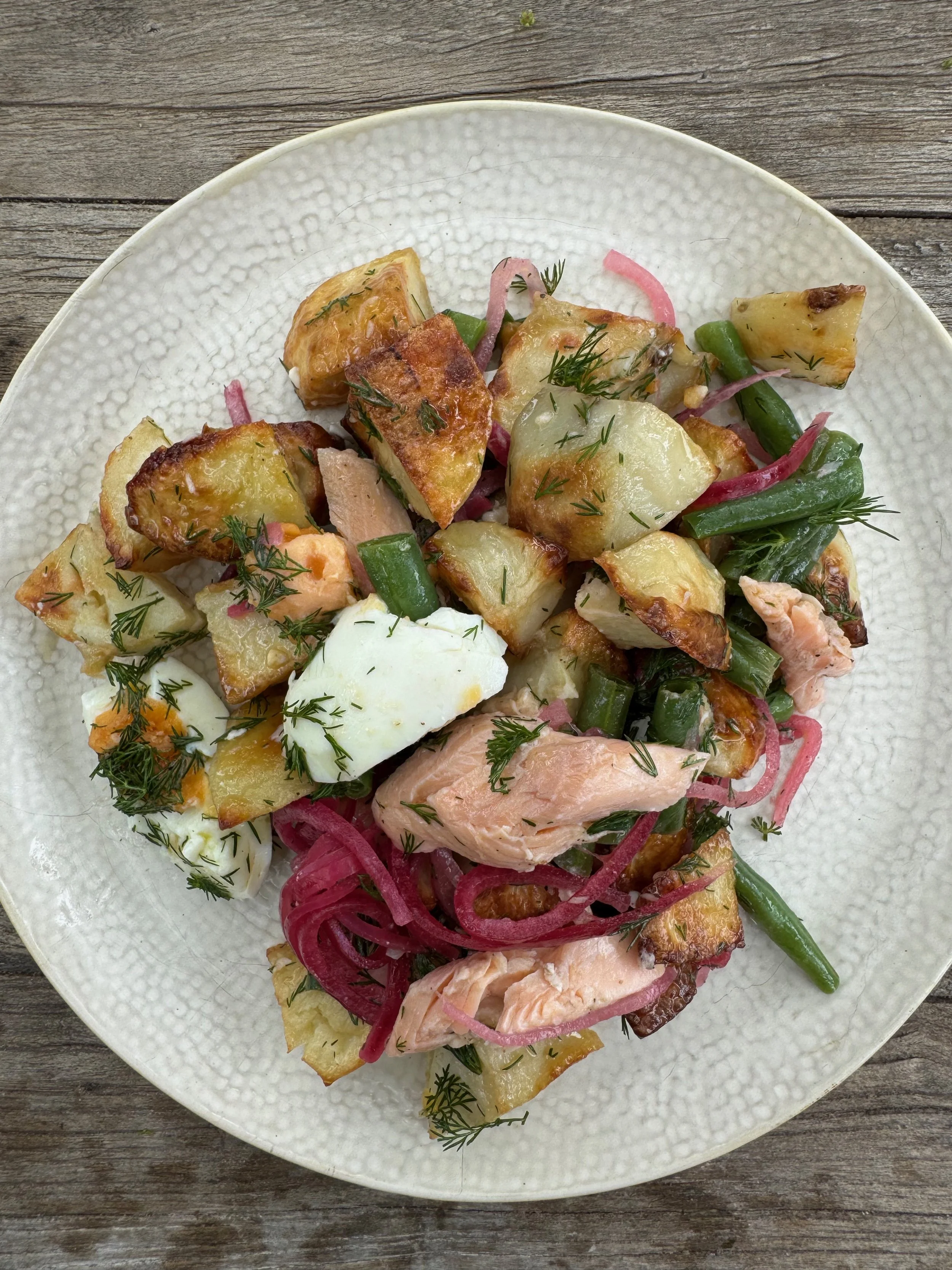 Add potatoes, beans, dill, pickled onions and smoked trout to the bowl and mix well.