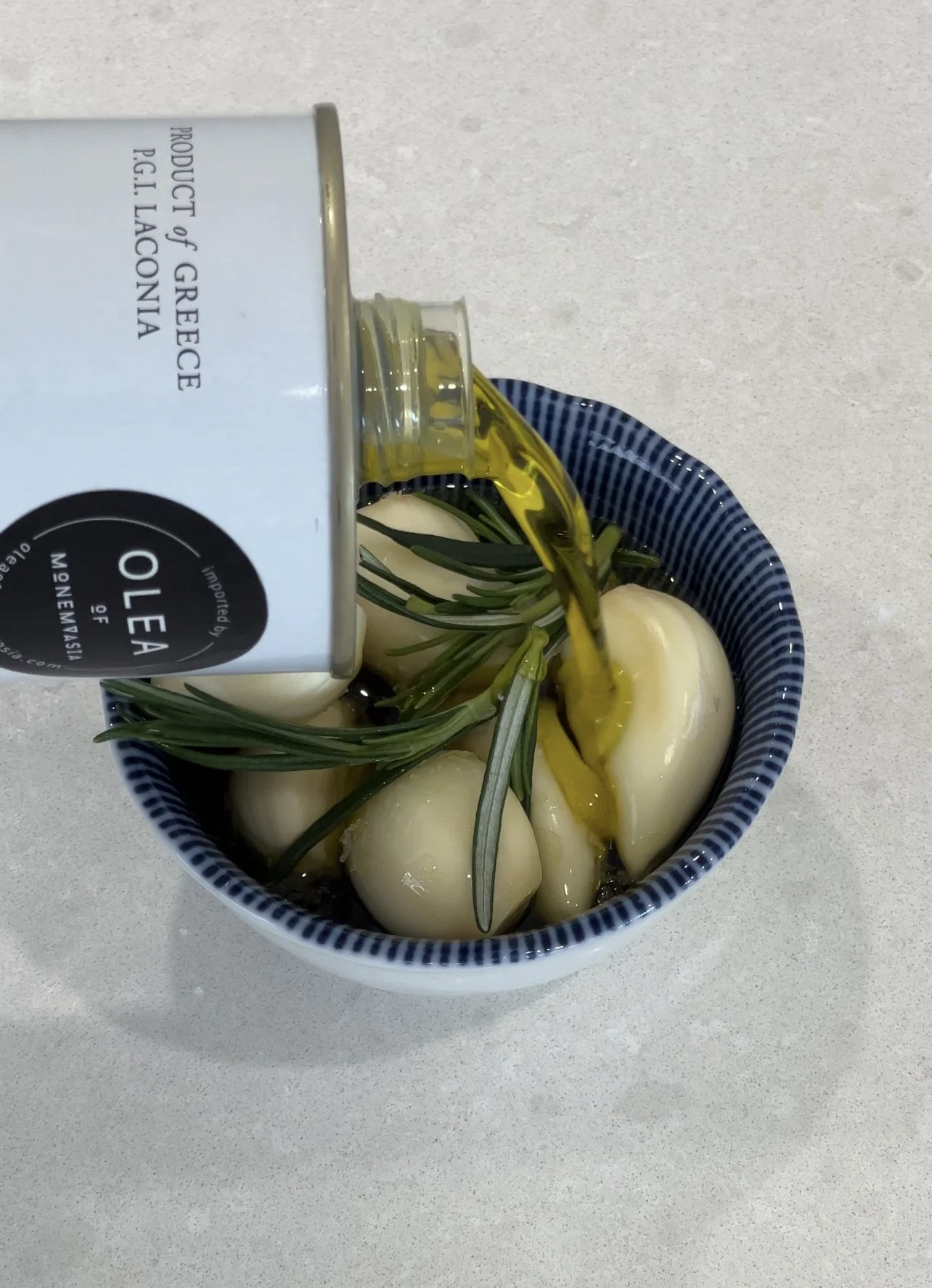 _Place the garlic cloves and rosemary into an ovenproof dish and fully submerge in extra virgin olive oil. It’s important the garlic is fully submerged in the olive oil so it does not burn